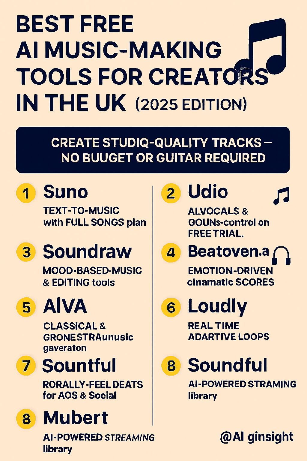 Top free AI music tools for UK creators include Suno, Udio, Soundraw, Beatoven.ai, AIVA, Loudly, Soundful, and Mubert. These platforms support everything from cinematic scores to adaptive loops and social-ready beats.