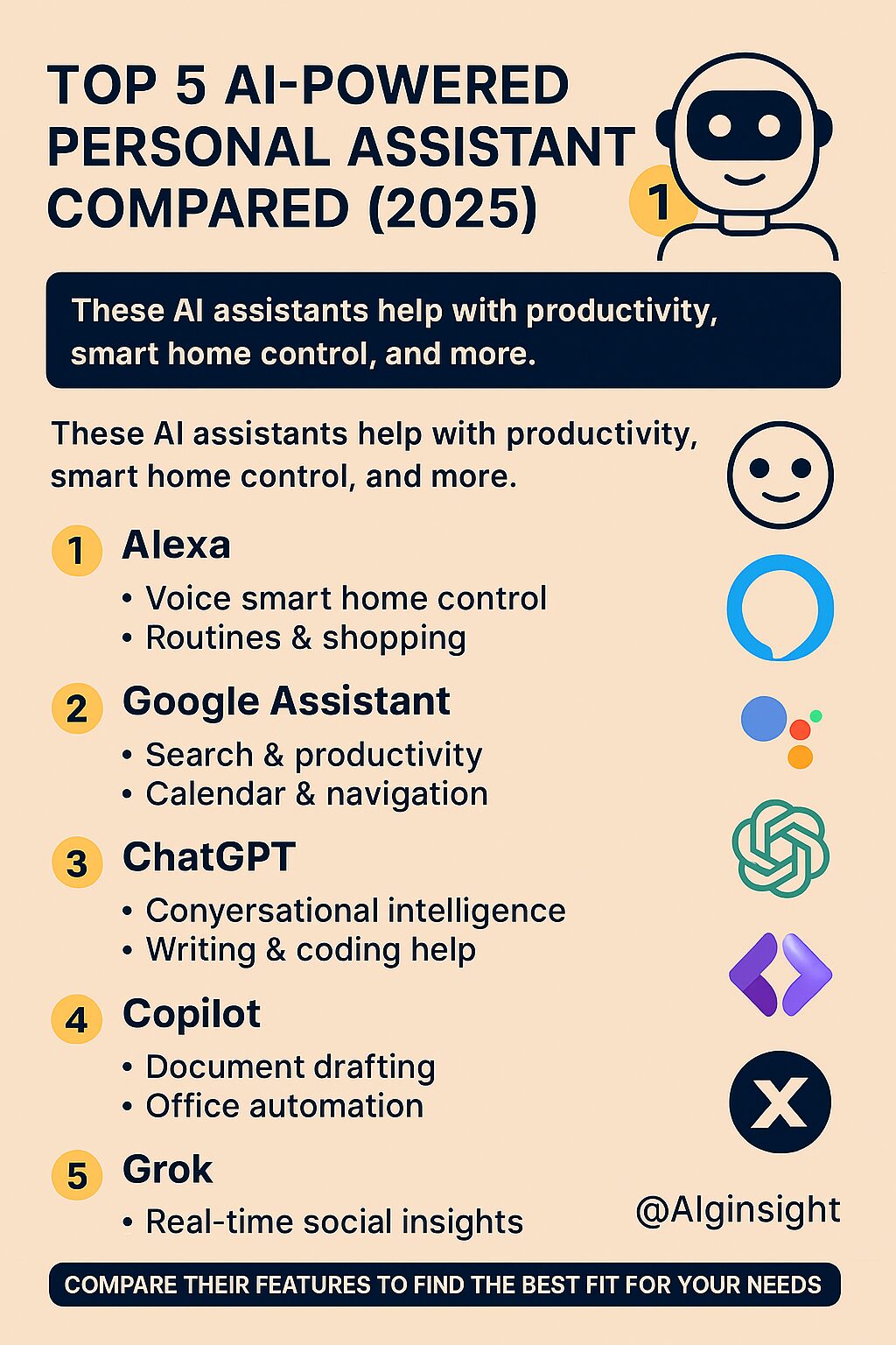 AssistantBest ForKey FeaturesPlatform IntegrationAlexaSmart home controlVoice commands, routines, device management, shoppingAmazon Echo, Fire TV, RingGoogle AssistantSearch and productivityNatural language search, calendar, navigation, smart device controlAndroid, Nest, Pixel, ChromeChatGPTConversational intelligenceContextual memory, writing help, coding, multimodal inputWeb, mobile app, APICopilotProductivity and creativityDocument drafting, summarization, task automation, image generationWindows, Edge, Office, mobileGrok (X AI)Real-time social insightsX platform integration, trending topics, conversational toneX (formerly Twitter), mobile app
